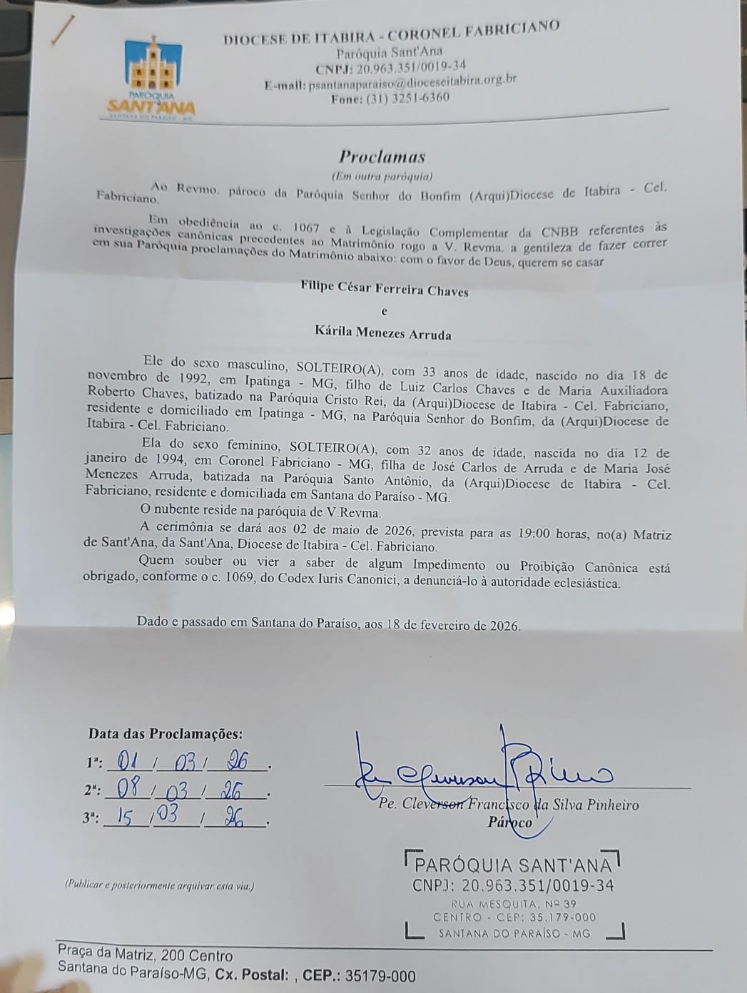 O proclamas é um edital civil onde a Igreja anuncia publicamente um matrimônio que será realizado. O proclamas é lido na igreja onde se realizará a cerimônia e também disponibilizado através de nosso site.